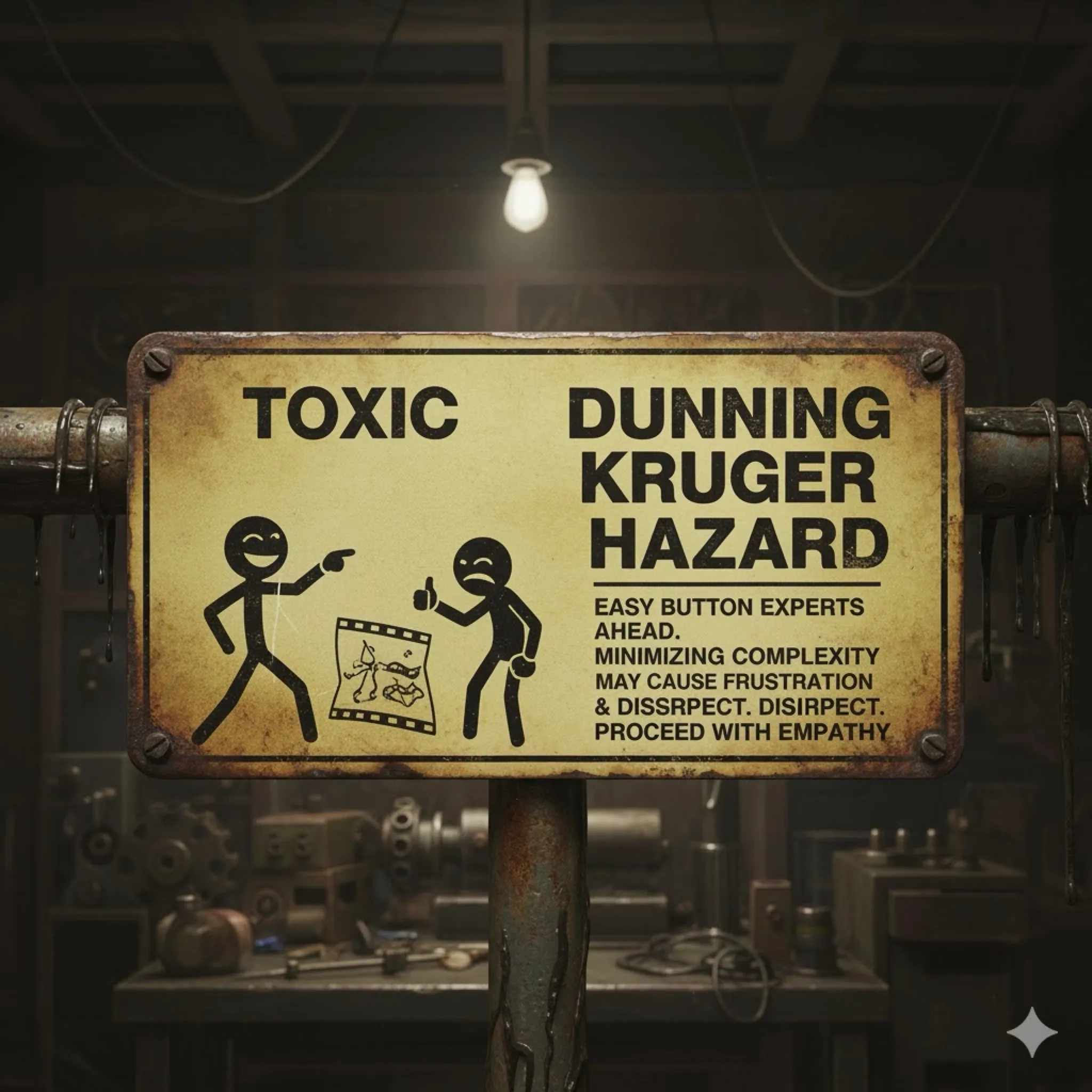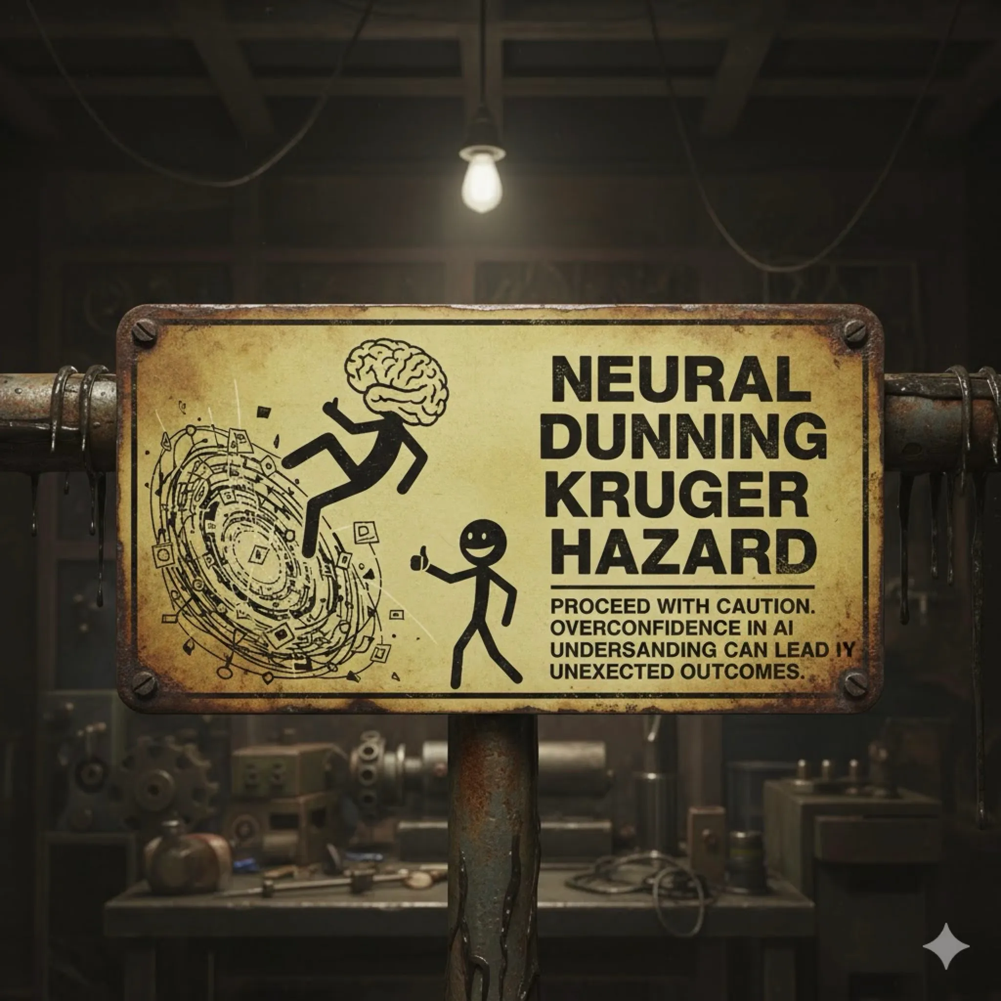 Let’s generate a warning sign image, the classic dirty machine shop sort, I’d like to show on the left some stick figure experiencing a hazard, and the lettering should say: Neural Dunning Kruger Hazard