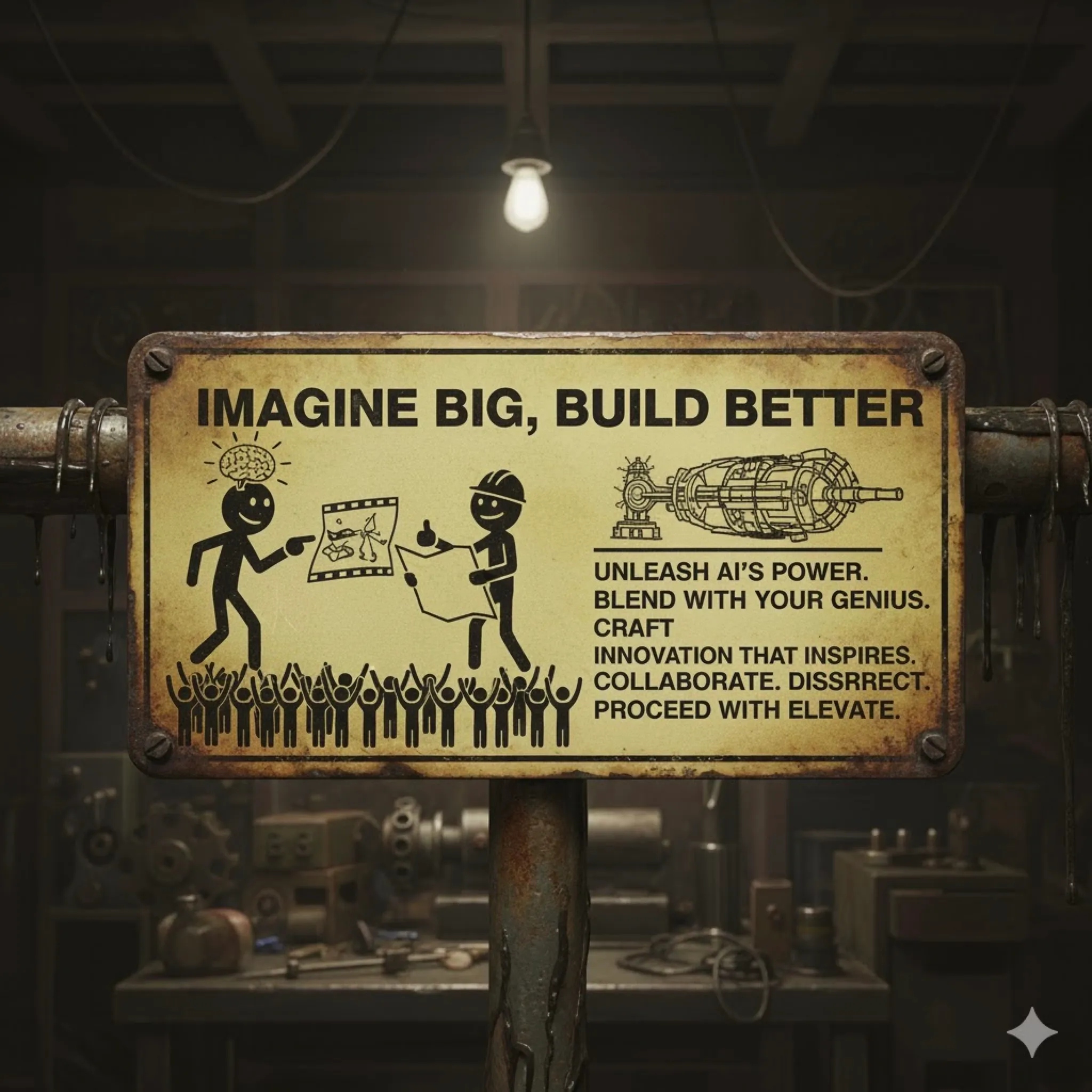 Let’s make a positive workplace poster for the garage like the old Think Twice Cut Once poster. In this case, we celebrate the great ideas that come from AI usage, but we apply our imagination and expertise for an outcome that uplifts others; Imagine Big, Build Better.